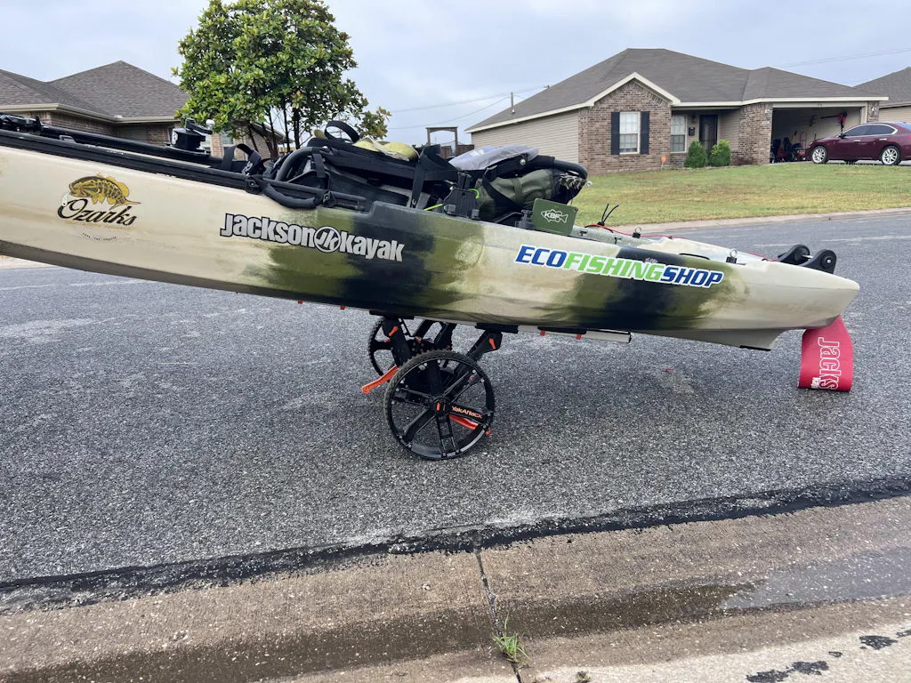 Storage and Collapsible Components: So, you’re at the launch, now what? Sometimes it’s not convenient to take your cart back to your vehicle, and doing so leaves your kayak and gear unattended and susceptible to theft. We solved this problem by making the BarCart ultra collapsible. The wheels can be removed with the push of a button. The bunk bars, long enough for even the widest fishing kayaks, collapse with a heavy-duty ferrule and bungee system, enabling them to go from a 44” deployed length to less than 18” in a compact and secure package. The uprights fold down, parallel with the axle, making it possible to store the BarCart inside the hull of a kayak. All of this can be performed with no tools using smart and simple buttons and levers. If needed, everything minus the centralized tiedown point can be removed from the aluminum axle.